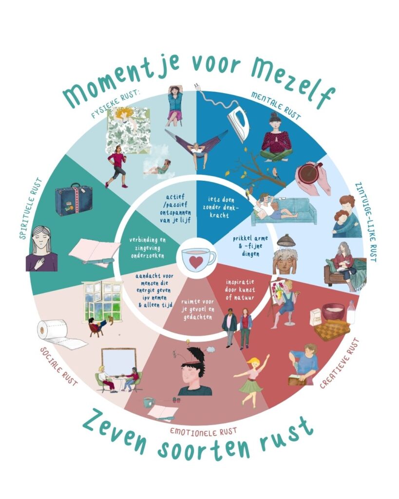 - Sociale, spirituele en emotionele rust: contact met een ander. Een kort praatje, een glimlach, een complimentje. Positieve verbinding doet meer voor je energie dan je denkt.