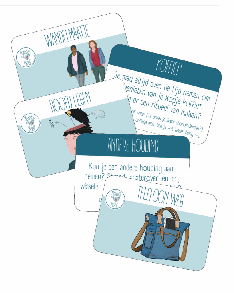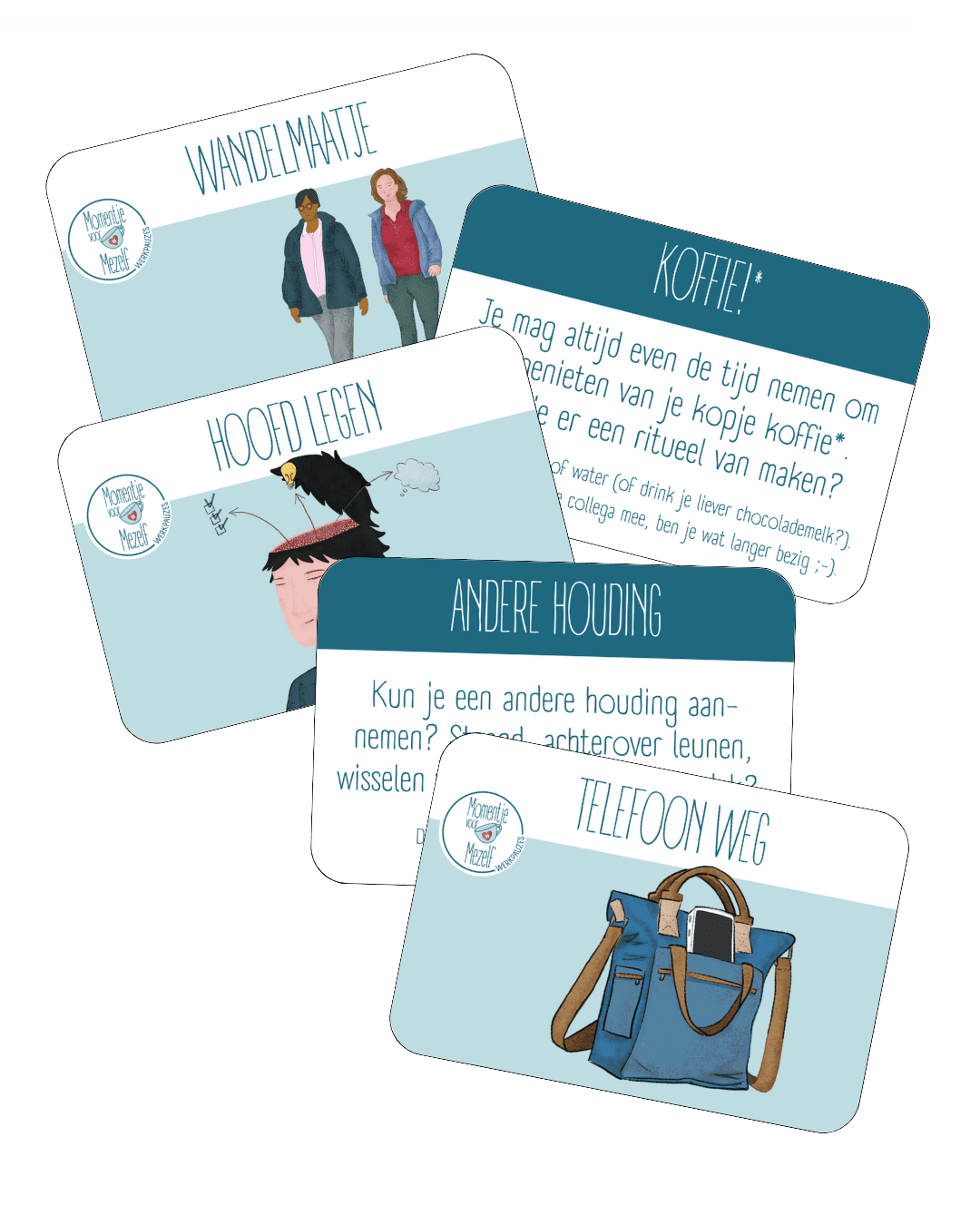 De set bestaat uit 50 geïllustreerde kaartjes met inspiratie voor korte pauzes die goed zijn voor je brein én je lijf – plus een kaartje met uitleg.
